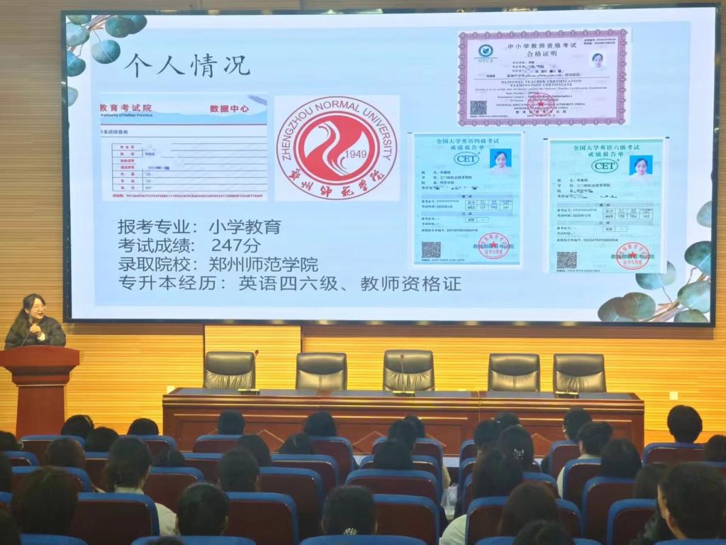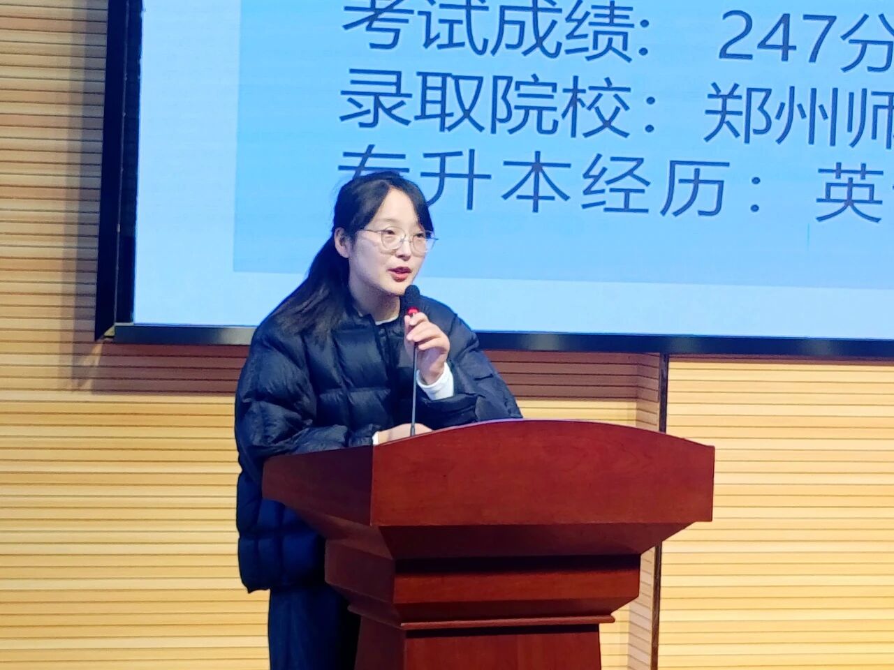 “考试成绩:247分,全省第四名,被郑州师范学院录取。”当这行字出现在大屏幕上时,台下响起了一阵赞叹声。这位来自小学教育专业的学姐,自信地分享着她的专升本经历。“英语学习需要持之以恒,每天积累才能取得理想成绩。”她简洁有力的发言,配以屏幕上清晰呈现的关键信息,让在场同学受益匪浅。随后,她从备考策略、时间规划、心理调节等多个角度,全面剖析了专升本备考的要点和方法。