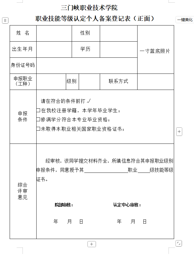 (一)如实填写《职业技能等级认定个人备案登记表》正反面的个人信息及成绩,在表格当中“学生本人承诺”栏本人签字。(见附件1)