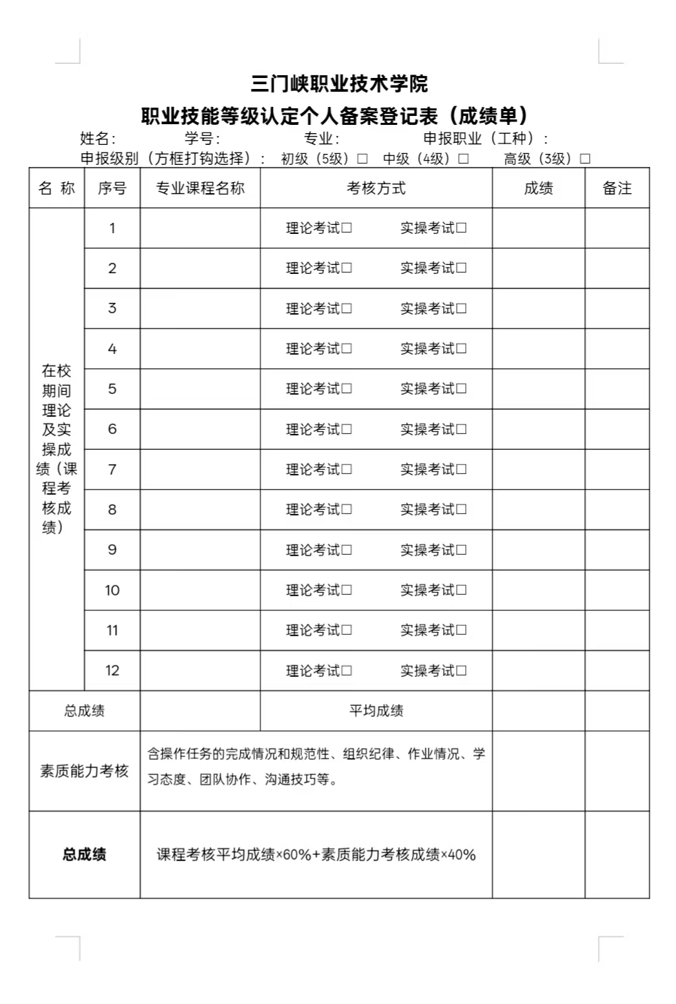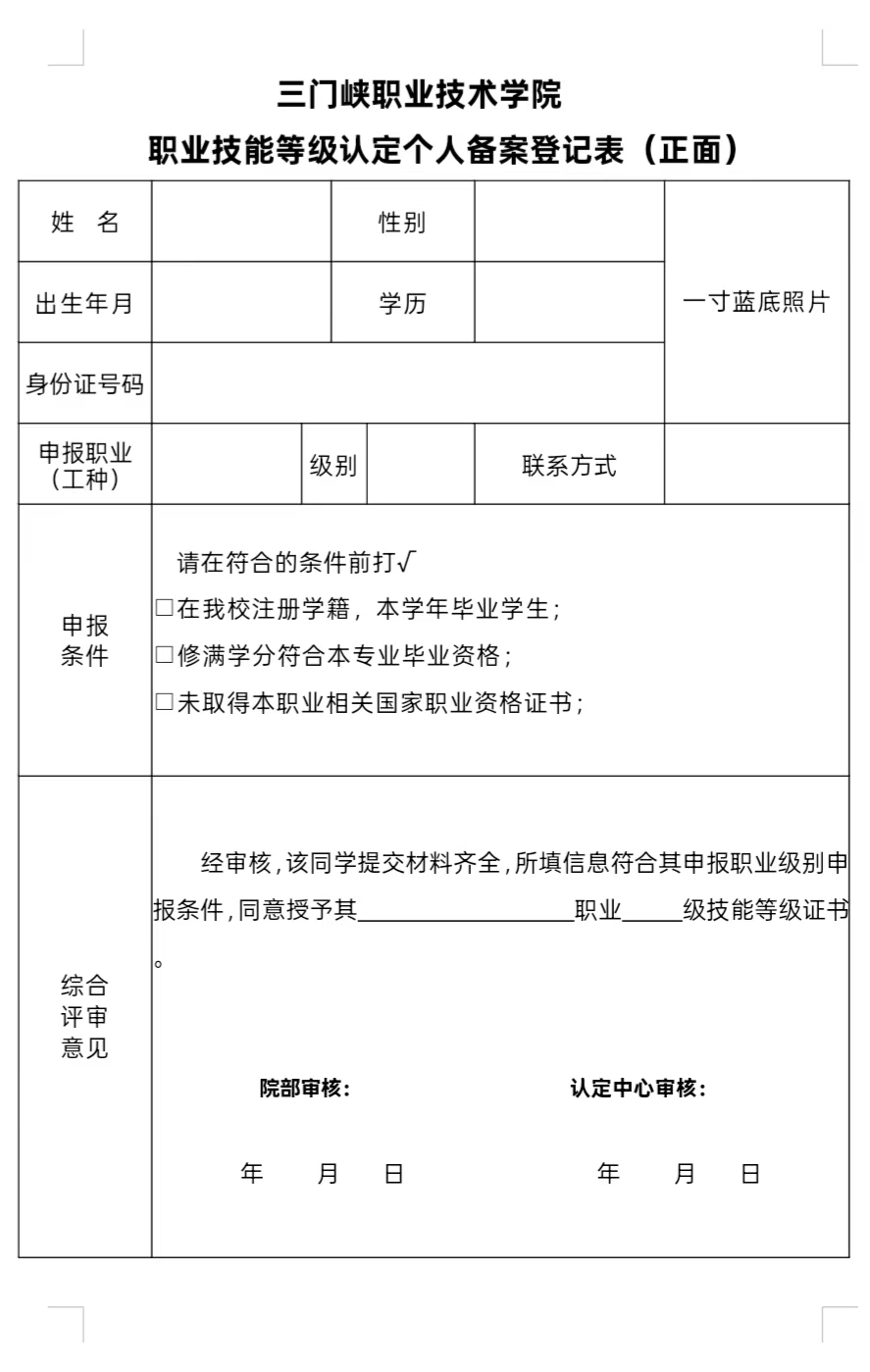 (一)如实填写《职业技能等级认定个人备案登记表》正反面的个人信息及成绩,在表格当中“学生本人承诺”栏本人签字。(见附件1)